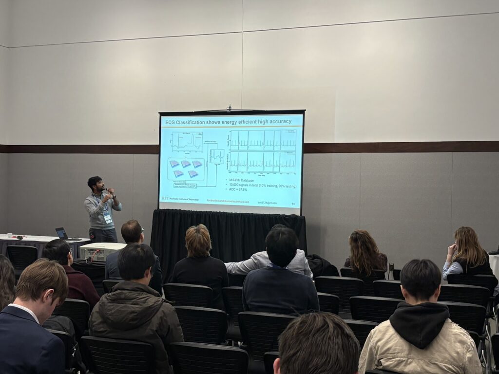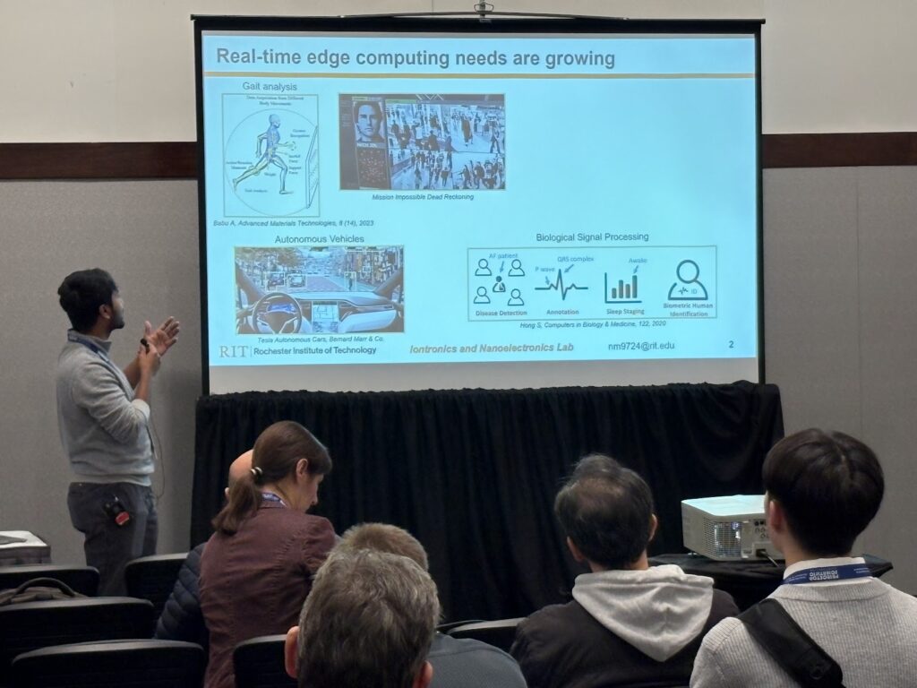 12/2/2025 Nithil presented his recent work at the 2025 MRS Fall Meeting. He shared our team’s progress on energy efficient, physics-based AI processing using 2D electric double layer transistors for edge computing, and he even opened with a Mission Impossible photo to keep the audience smiling while talking about device physics. Great job, Nithil!
